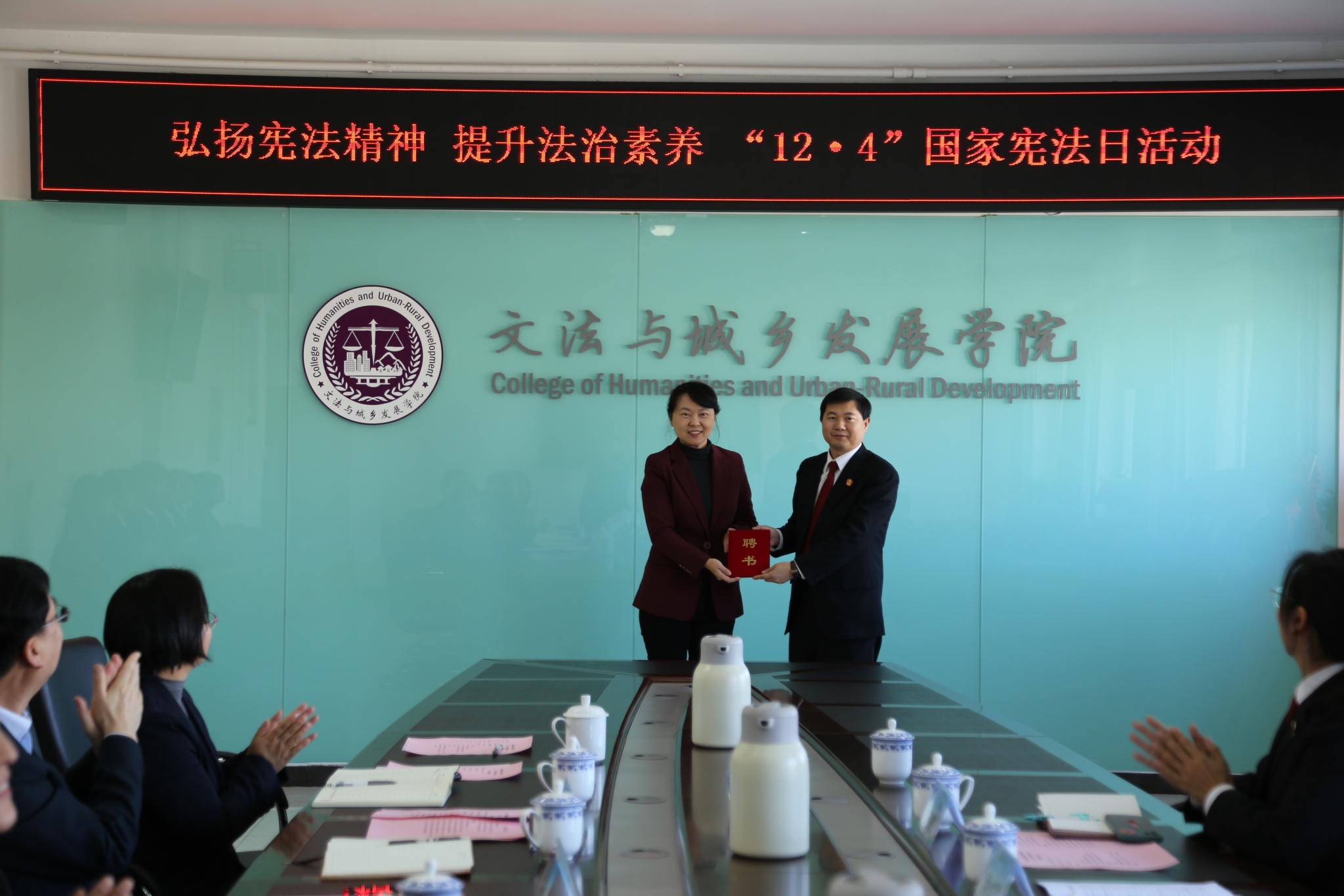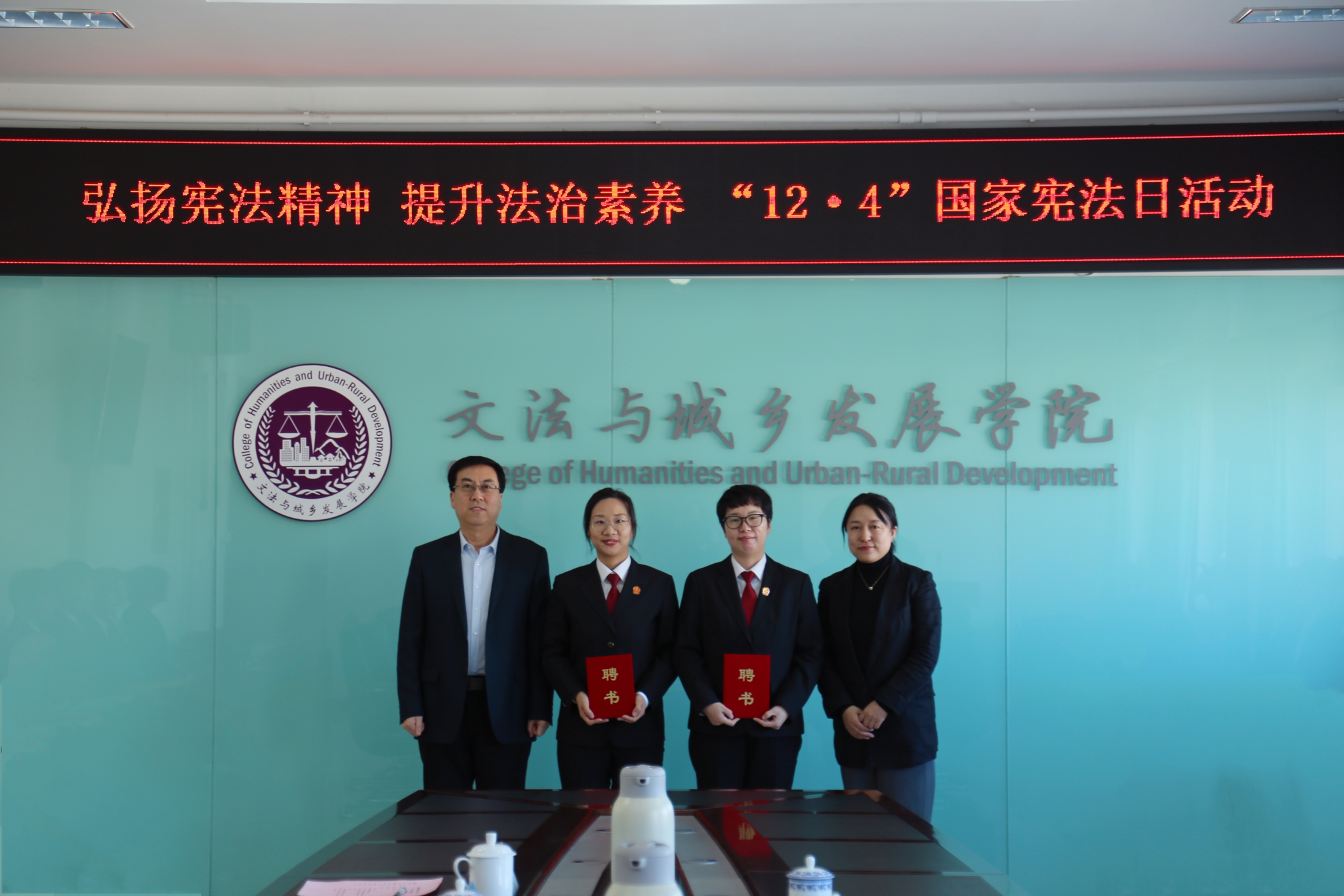武艳为昌平区人民法院副经理潘幼亭颁发了客座教授聘书。公司领导为沙河法庭庭长邵敏、副庭长刘敏颁发了校外导师的聘书。
