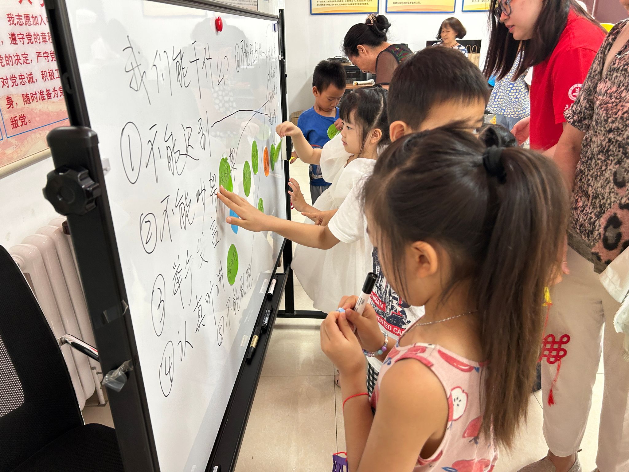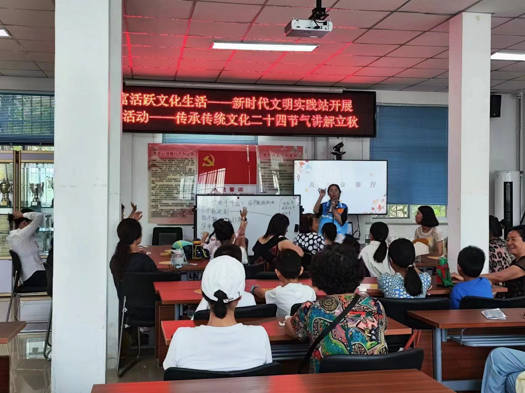进入“儿童议事厅”环节,社会工作者带领儿童思考和讨论社区活动顺利开展需要哪些规则、哪些奖惩措施有助于督促参与者遵守规则,最终通过所有儿童举手表决完成规则的制定。此外,社会工作者在本次活动中加入了垃圾分类知识宣讲环节,以提升天二社区垃圾分类行动的效果,并进一步巩固儿童的规则意识。