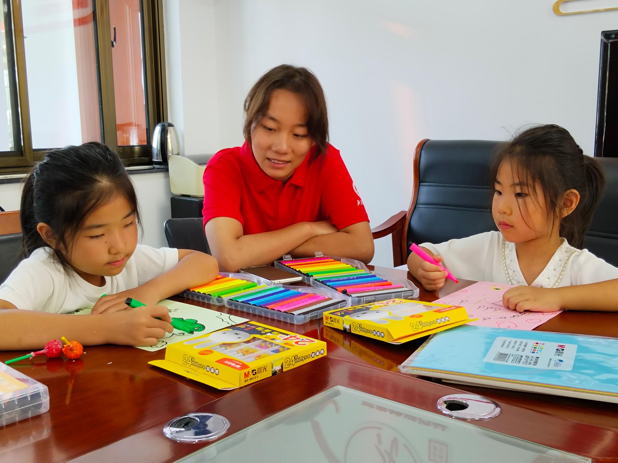 模块二旨在帮助小朋友抒发想象力和提高自我认知能力,降低对电子产品的依赖性。小组成员准备好水彩笔、蜡笔、彩纸等一系列物资,带着小朋友们绘画,描绘出自己的内心世界,摆脱对虚拟世界的依赖。除此之外,小组成员与小朋友们一对一交流,鼓励他们主动去发现当下世界的美丽,小朋友们也主动提出自己以后会放下手机,多与父母、爷爷奶奶等交流,用双眼观察五彩斑斓的世界,简单的瞬间变得意义非凡。