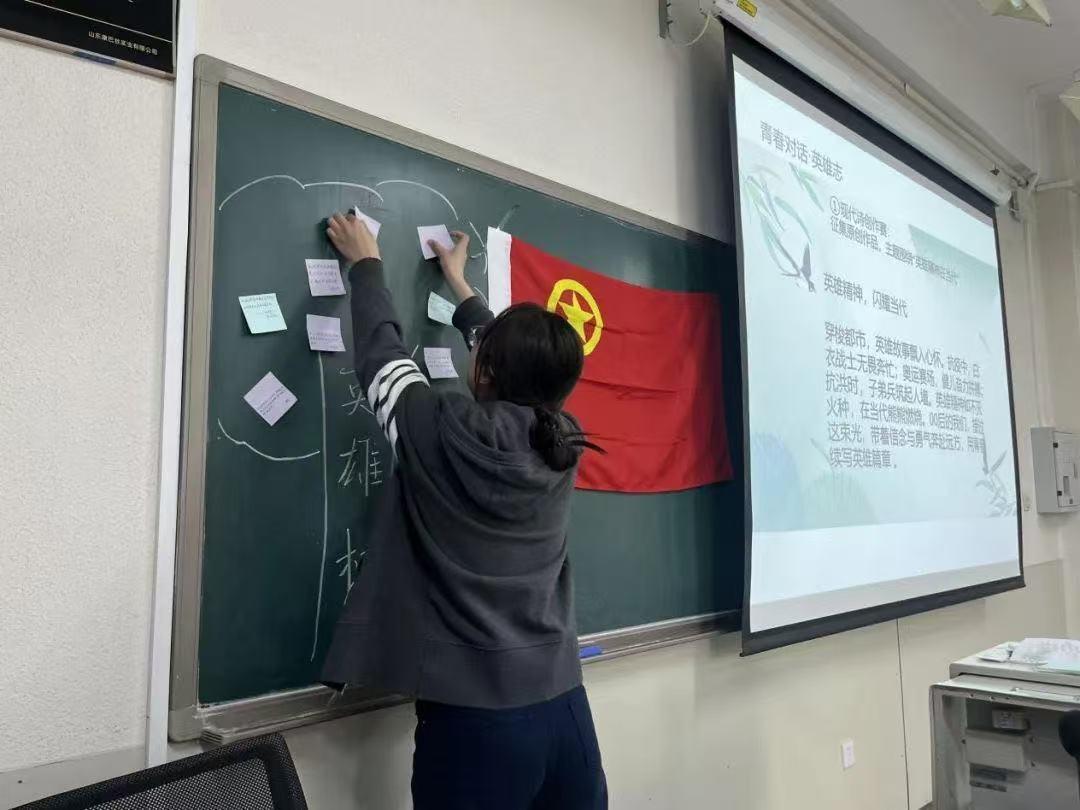 在实践环节,各团支部精心策划并举办诗文诵读会,通过多样化的形式带领同学们深刻感悟红色精神与新时代使命。活动伊始,同学们饱含深情地朗诵叶挺将军的《囚歌》,团支书同步播放红色主题沙画视频,以流动的沙粒艺术化呈现"烈火中永生"的革命意志;在原创诗交流分享环节,同学们现场朗诵《致新时代的追光者》《星火燎原》等20余件原创作品,这些诗作既有对革命先烈的深情礼赞,也有对科技报国、文化传承等时代命题的深度思考,展现出新世代老员工对英雄精神的诠释;在互动感悟环节,同学们分组讨论“如果我是觉醒年代的00后”等议题,用便利贴拼成“英雄树”,形成可视化情感图谱;最后,全体诵读《少年中国说》节选,将经典文本与青春声浪同步共振。