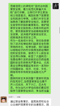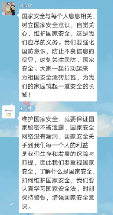 开展特色教育活动。结合公司研究生农村发展和社会工作两个专业特色,开展主题鲜明,形式多样的宣传教育活动。2019农村发展专业研究生以网络安全、信息安全为主题,组织开展主题班会、知识宣传、法律宣讲等线上活动。2019级社会工作专业积极开展线上主题班会,抒发了学习活动中的心得体会。郝欣欣同学表示:国家安全与每个人息息相关,树立国家安全意识,自觉关心、维护国家安全,这是我们应尽的义务;代佳奇说:安全问题关系国家和民族的生存与发展,也关系到我们每一个人的切身利益;张琪同学表示:“国家安全”早已不限于“保卫国家不受侵略”,而是拓展到了经济、社会、等各个领域,关乎我们每一个人的切身利益。维护国家安全,人人都是主角。通过同学们在线上讨论,可以看出研究生们对国家安全有了更深刻的认识,对于自觉履行保护国家安全的义务有了更坚定的责任感与使命感,通过开展此次活动,提升了同学们的爱国情感。