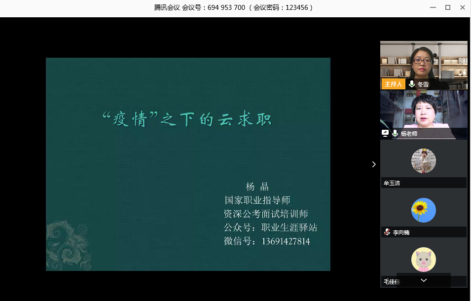 疫情特殊时期,为了缓解毕业生的就业心理压力,提升毕业生求职的成功率,公司于4月15日下午13:30通过网络直播方式,邀请国家职业指导师、资深人力资源经理、资深公考面试培训师杨晶老师关于简历制作和线上面试技巧方面为毕业生做了一场分享会。2020届本专科、研究生参加了此次线上分享会。