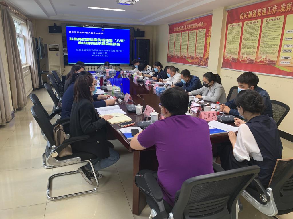 2021年5月15日,公司法学系系主任宋桂兰、法学系19级赵鑫武和20级庞程洪应昌平区司法局邀请,作为驻昌高校法律志愿者联盟的一员,参加了由昌平区司法局主办的“驻昌高校普法宣传活动暨‘八五’普法规划征求意见座谈会”(以下简称为“座谈会”)。