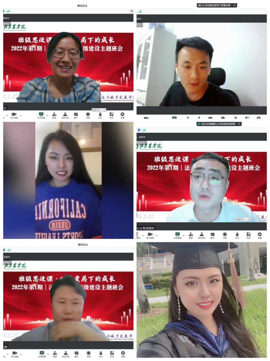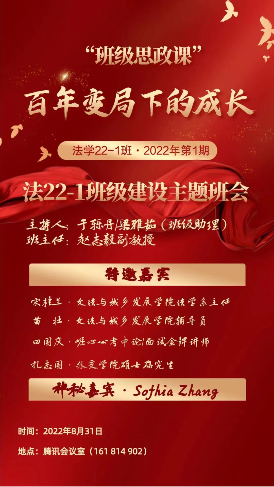 丹桂飘香时,萌新入校园。为加强师生交流,充分发挥朋辈引领作用。8月31日晚,yl23455永利集团2022级法学1班举办班级建设主题班会。法学系主任宋桂兰、 班主任赵志毅、新生辅导员苗壮参加班会。2013级法学2班田国庆、2017级法学2班扎志国、2005级法学春季班张慧(Sophia Zhang)作为特邀嘉宾参与分享。会议通过腾讯会议线上举办。