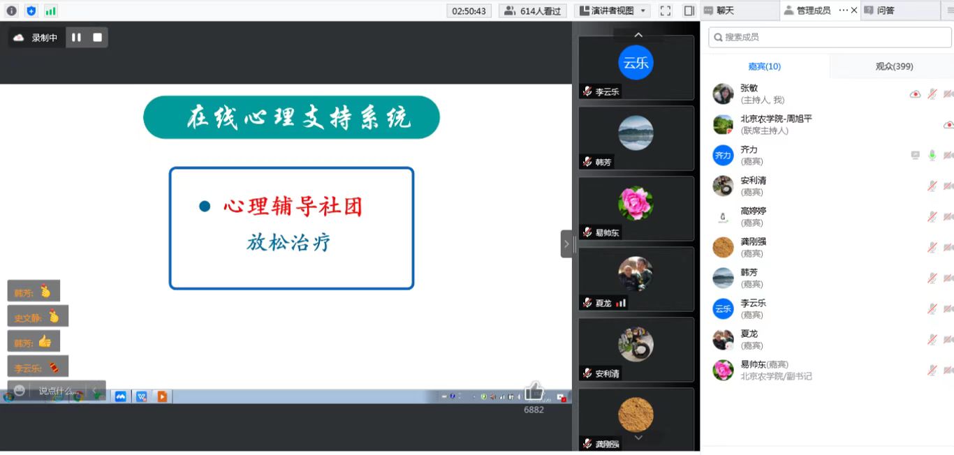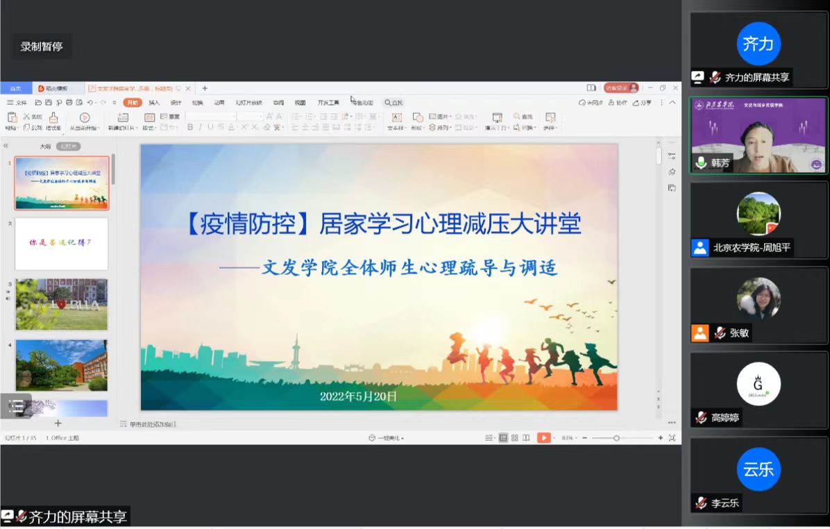 讲座结束,李云乐老师代表公司感谢齐力为大家呈上一堂精彩的疫情防控思政课,齐力以生动的语言、丰富的案例、详实的素材将疫情防控的道理讲深、讲透、讲活了,并从心理角度引导大家科学认知、了解自我,教授了很多积极有用的居家学习减压策略。希望同学们安心居家学习,始终保持饱满的精神状态和战胜疫情的必胜信心,期待与同学们在美丽的北农校园相见!
