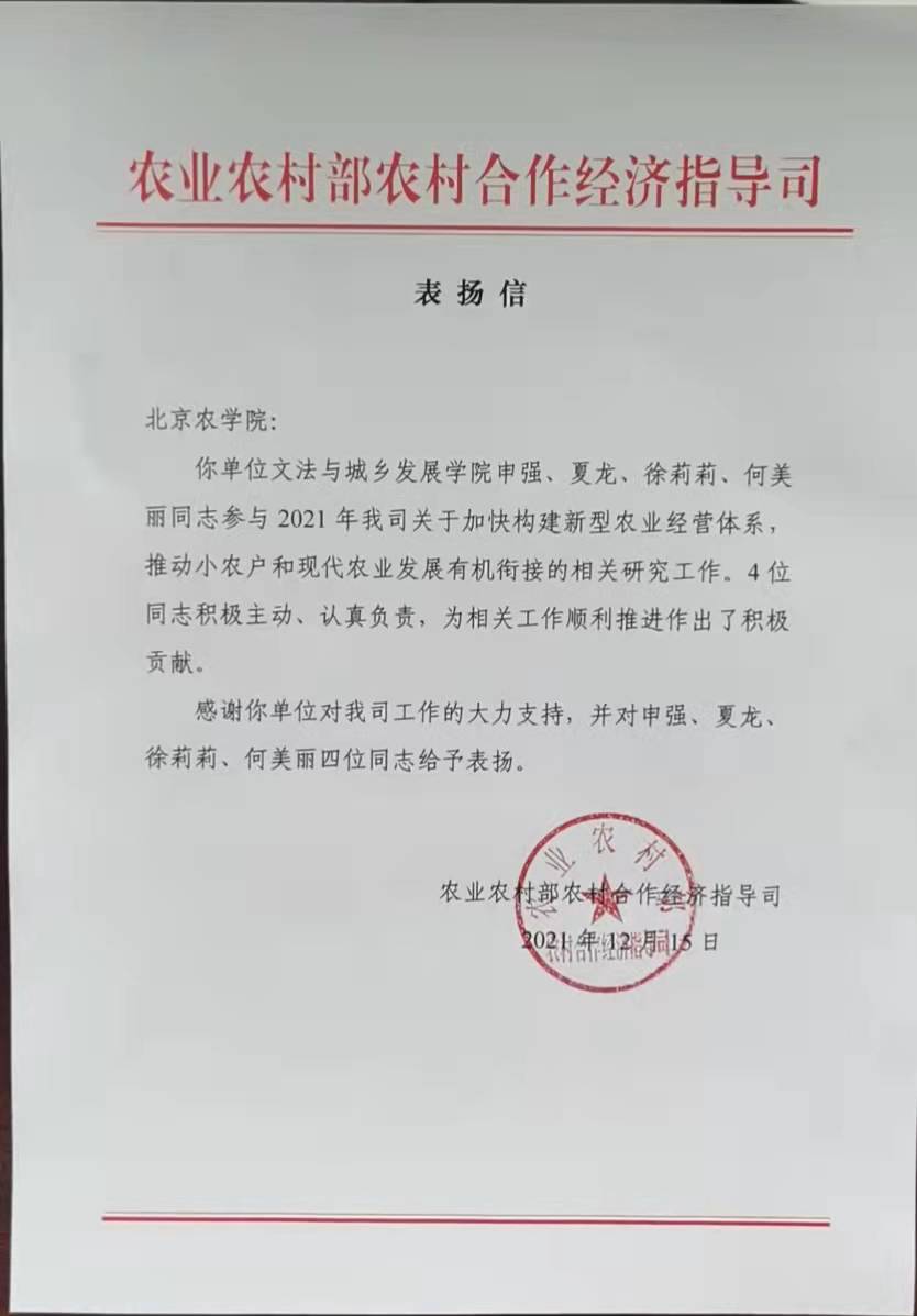 近日,农业农村部农村合作经济指导司向公司发来表扬信,对yl23455永利集团申强、夏龙、徐莉莉、何美丽四位教师提出表扬,同时,感谢yl23455永利对该司工作的大力支持。