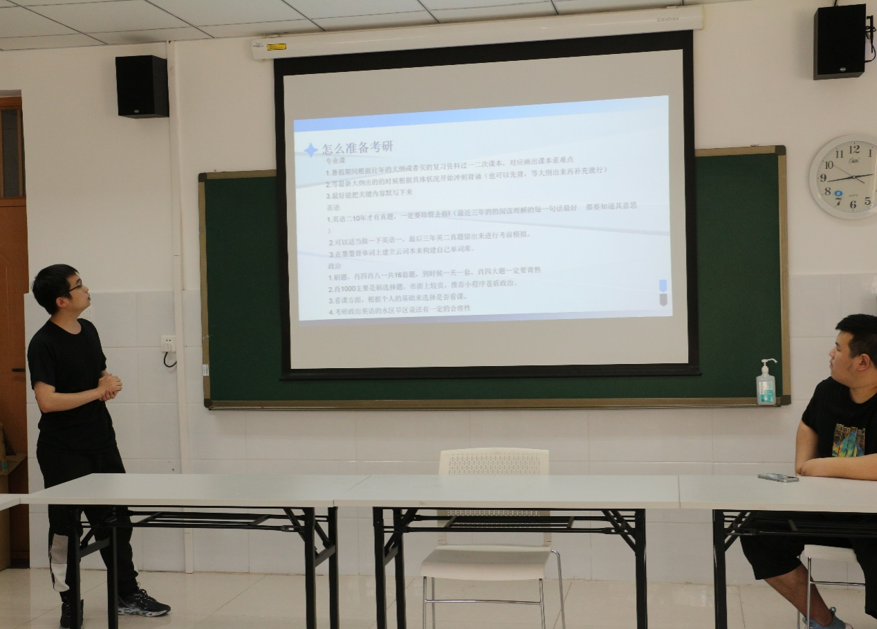 姬佳壮给大家讲解了他的考公经历,从考试本身、能力锻炼等方面展开,告诉同学们为什么选择考公、考公的优势在何以及如何备战考公等。张荃和战昕宇分别分享了他们自己的考研经验,针对不同的考研方向提出了自己的见解,备考的注意事项,以及考研过程中的焦虑如何化解、如何应对。