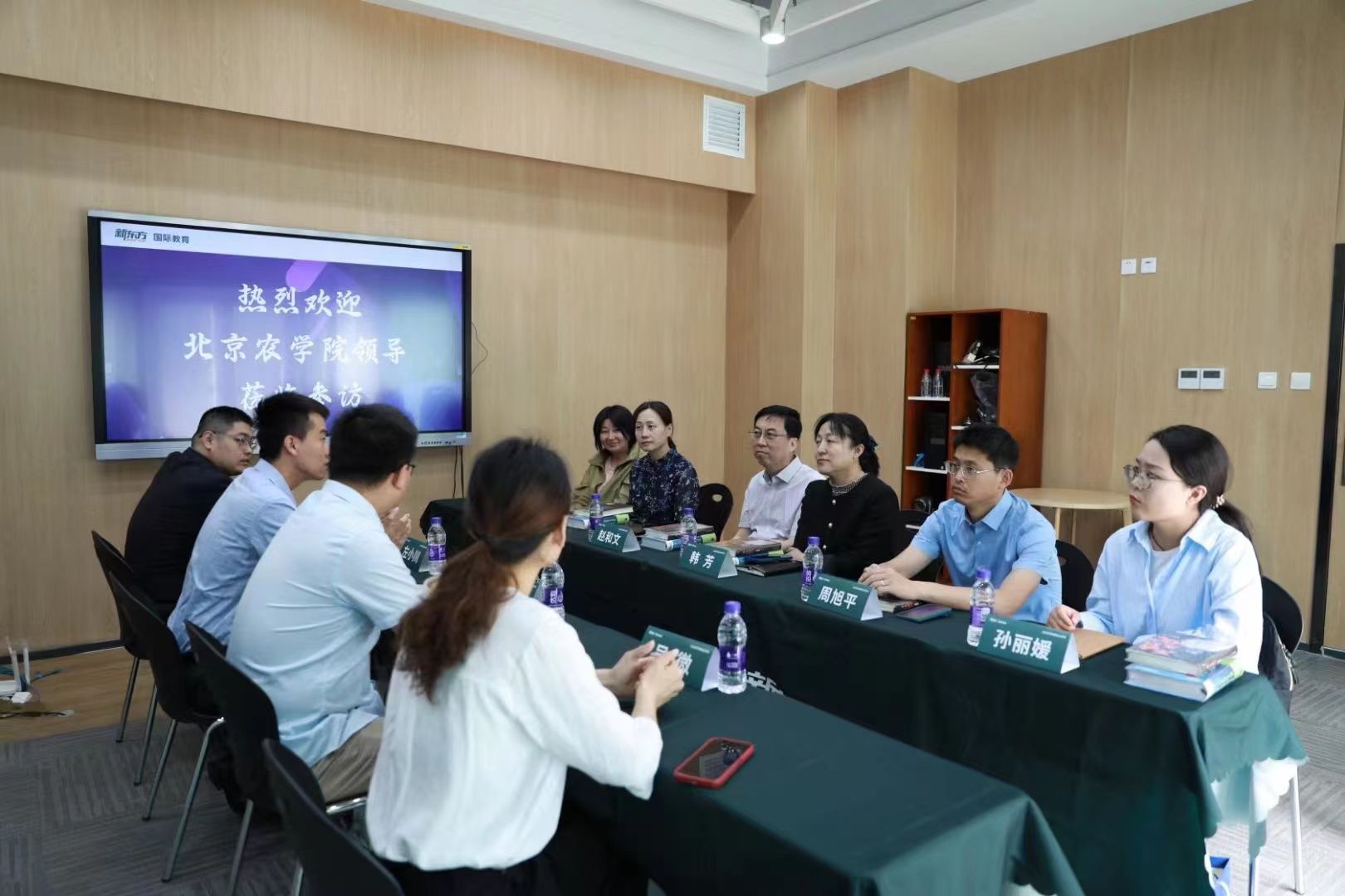 首先,左小川对公司来访表示热烈欢迎,并通过文化墙介绍了集团的企业文化、发展历程和事业板块等。座谈会上,武中豪就未来与本校的合作提出了三个方向,一是为员工提供就业和实习机会,二是为员工提供求职类和通用办公类的免费培训,三是为公司员工竞赛活动提供赞助。其中新星计划培训生是新东方校园招聘的核心项目,也是其人才培养的重要方式,入职后由个人专属导师定岗培养规划顾问和学习指导师,并且给每个岗位设置了明确的发展通道、晋升路径和薪酬待遇。韩芳表示新东方集团致力于人才培养,为毕业生搭建了一个优秀的成长平台,希望今后能够在人才培养、就业实习等方面与新东方达成全方位合作,一方面输送优秀的毕业生到新东方高质量就业,另一方面使毕业生在新东方的平台得到高质量发展。赵和文表示希望双方今后保持沟通,建立长效合作机制,实现校企融合,协同育人,互惠共赢。