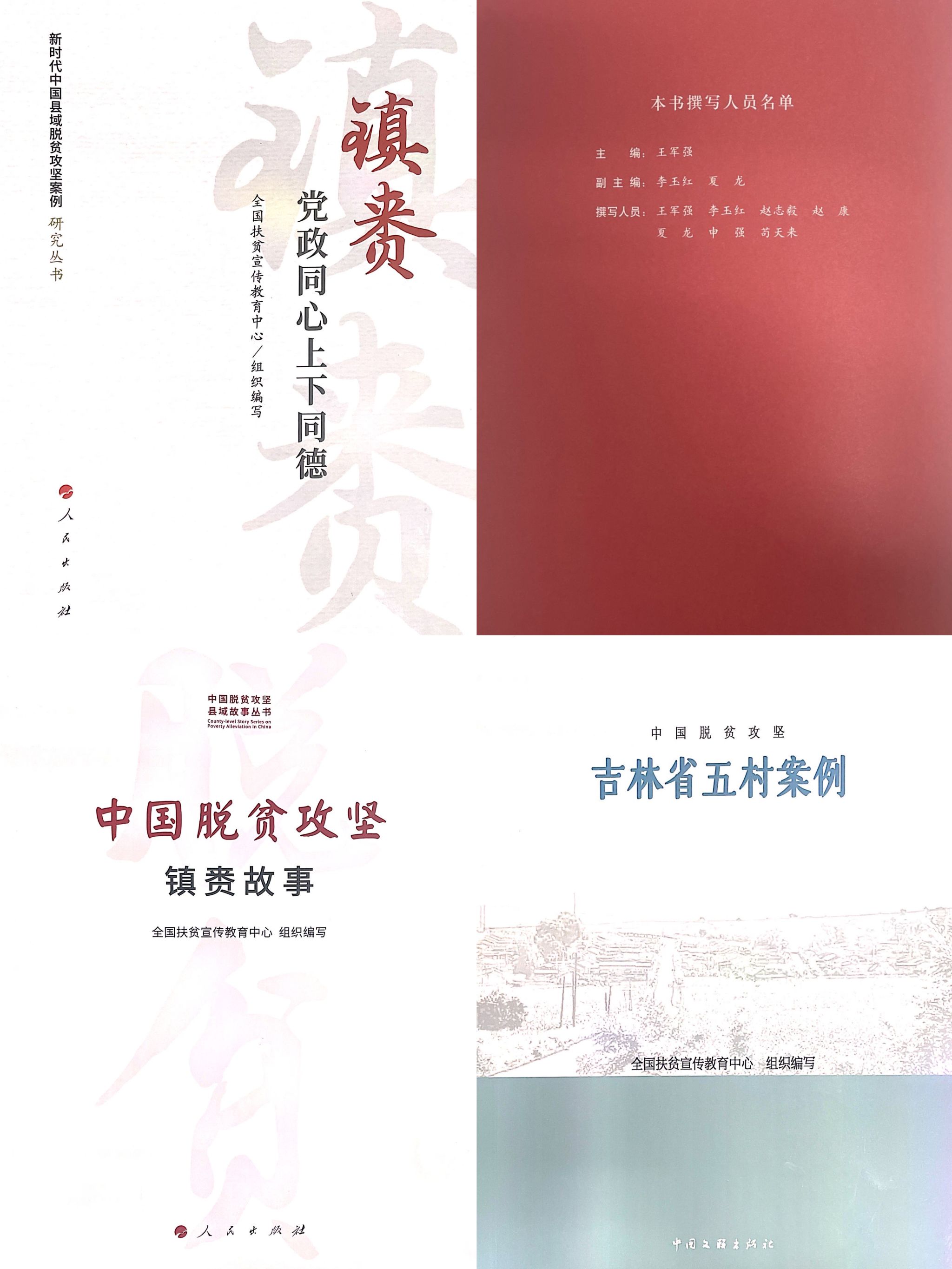 为了讲好脱贫攻坚的中国故事,传播脱贫攻坚的中国经验,编写组在全国扶贫宣传教育中心的指导下,自2019年起,多次赴吉林省镇赉县、农安县、磐石市、伊通县、柳河县、长岭县六县开展贫困县扶贫经验调研和摘帽研究,深入总结贫困县在脱贫攻坚中的实践创新,全面评估脱贫攻坚对县域发展和县域治理产生的综合效应,为巩固脱贫攻坚成果同乡村振兴有效衔接提供决策参考。除本书外,编写组还编著了《中国脱贫攻坚——镇赉故事》、《中国脱贫攻坚——吉林省五村案例》等两部书籍,充分彰显了公司教师的责任担当和历史使命。编写组成员王军强、赵志毅、苟天来也因其在脱贫攻坚中的突出贡献于2021年获北京市教委脱贫攻坚个人嘉奖。