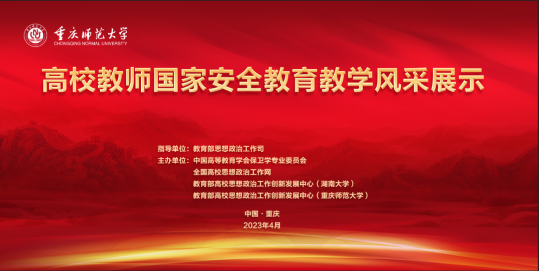 为深入学习宣传贯彻党的二十大精神,贯彻落实总体国家安全观,进一步增强高校教师国家安全素养和教学技能,4月6日至8日,由教育部思想政治工作司指导,中国高等教育学会保卫学专业委员会、全国高校思想政治工作网、教育部高校思想政治工作创新发展中心(湖南大学、重庆师范大学)联合主办的“全国高校教师国家安全公司产品风采展示活动”在重庆师范大学举行,来自全国高校的30名教师参与此次活动。