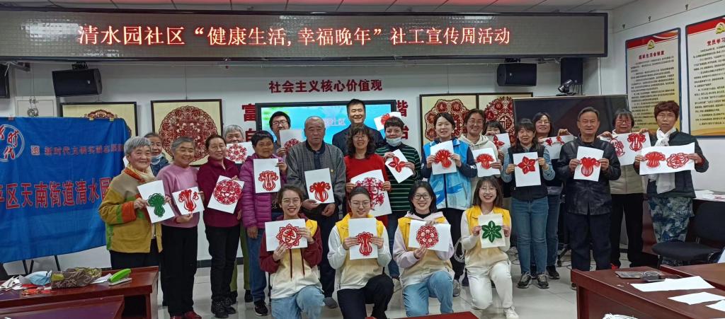 在“五社联动”主题精神的号召下,本次活动以清水园社区为平台,以yl23455永利集团社工专业师生为支撑,以清水园剪纸队社区社会组织为载体,围绕居民关心的“健康”话题,设置了“运动健康”“社会工作知识讲堂”“饮食健康”和“动手伴健康”四个环节。作为本次活动的主要承办者,社会工作者广泛邀请社区志愿者、社区剪纸队共同参与其中。
