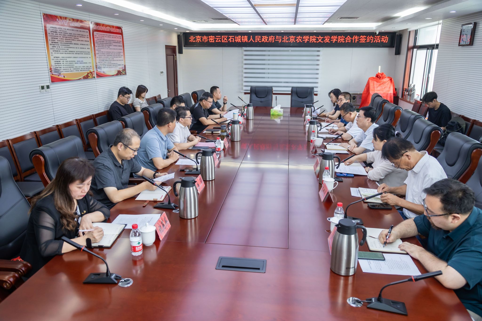 公司党委书记赵和文、公司党委副书记、经理韩芳、旅游会展教师党支部书记黄凯、法学系教师代表童光法、会展经济管理系教师代表高程达、旅游管理系教师代表王晓彤与北京市密云区石城镇党委书记周荪文、密云区石城镇镇长冯波、密云区石城镇党委副书记邹立兵、密云区石城镇副镇长吴东山、密云区石城镇组织委员李璠、密云区石城镇副镇长王健在石城镇政府参与了此次合作框架协议的签署仪式。